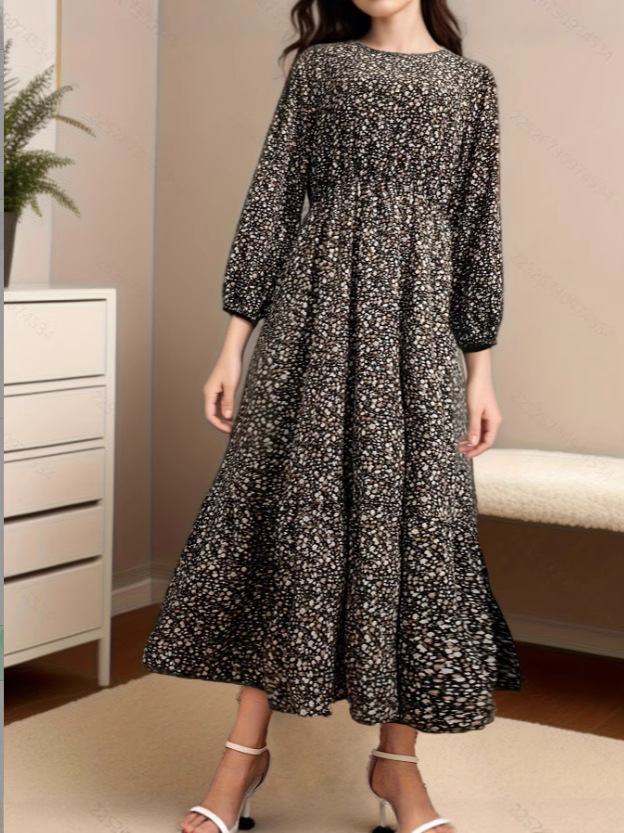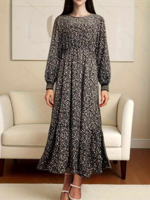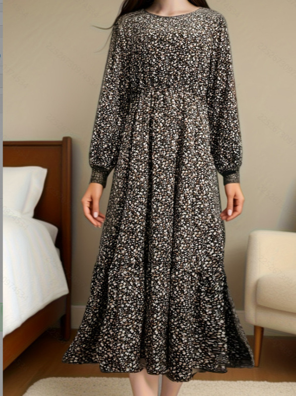 New Chiffon Round Neck Tie-waist Long Sleeve Knee-length Dress